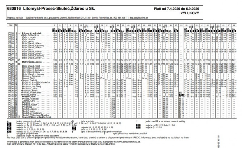Z důvodu uzavírky silnice v Jiříkově u Dolního Újezdu, která začne dne 7. 4. 2026, dojde u některých spojů k časovým úpravám v souvislosti s vedením objízdné trasy. Tyto změny se mohou v některých případech dotknout i dalších spojů z turnusového hlediska nasazení vozidel.