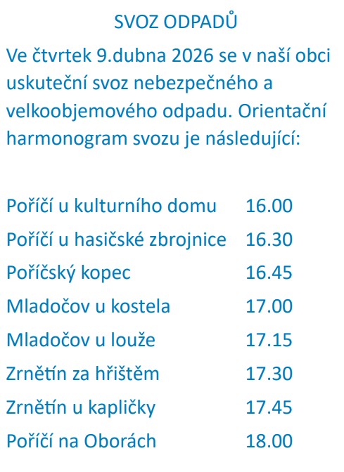 Obec Poříčí u Litomyšle a kulturní komise pořádají 8. 11. 2025 zájezd do divadla Karlín na muzikálovou pohádku ZLATOVLÁSKA. Zájemci ať se hlásí u Kateřiny Kusé (604 993 612), kde dostanou i bližší informace.