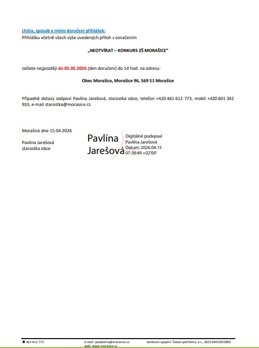 Závěrem chci poděkovat každému, kdo se zapojil do příprav této slavnostní akce. Děkuji zastupitelstvu obce za schválení a financování tohoto projektu, stejně tak Ministerstvu vnitra a Pardubickému kraji za finanční podpory. Zapomenout nemohu na místostarostu Radima Bártu, který celou stavbu projektoval a firmě Stavební sdružení Boštík, s. r. o. za precizně odvedené provedení této stavby.
